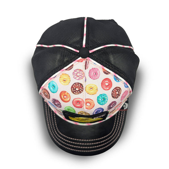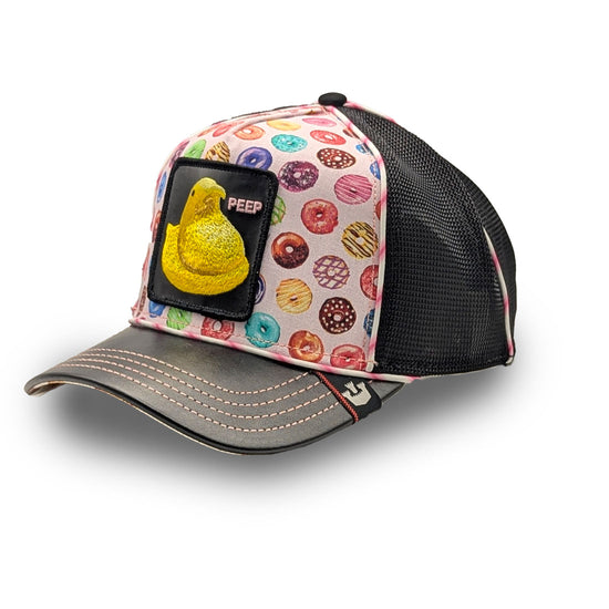 Das Frontpanel aus robustem Material ist mit bunten Donut-Motiven verziert – perfekt für alle, die auffallen möchten! Das gestickte Patch zeigt ein gelbes Küken ("Peep") und setzt einen witzigen Akzent, der garantiert Aufmerksamkeit erregt.