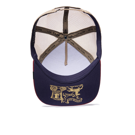 Das kräftige Marineblau der Front trifft auf ein kontrastreiches Burgundy-Visier mit auffälliger Ziernaht. Beige Mesh-Elemente sorgen für angenehme Belüftung an heißen Tagen und runden den Retro-Look perfekt ab. Dank Snapback-Verschluss sitzt die Cap wie angegossen – ganz egal, ob du gerade durch die City fliegst oder auf dem Rooftop chillst.